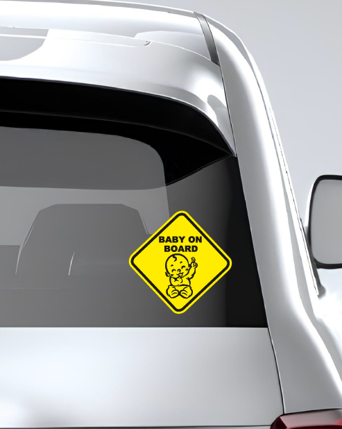 Adesivo "Baby on Board" con bambino stilizzato.